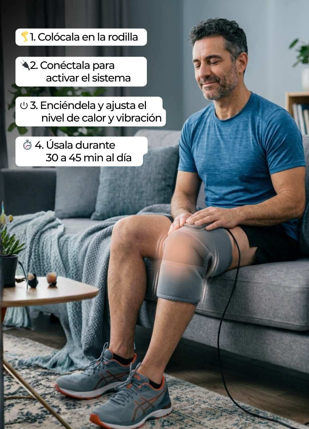 Sigue estos 4 sencillos pasos y disfruta del calor terapéutico y los micro masajes en tu rodilla.